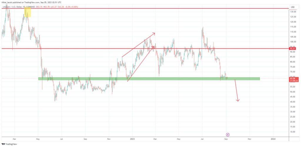 After the “halving” sell the news and the false break above 100 figure, Litecoin dropped like a stone and at this moment is trading back to important 60 zone support.