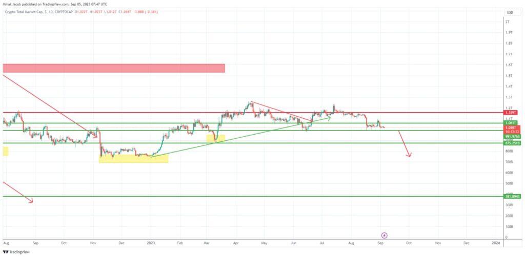 After retesting the recent high in the 1.2T zone during mid-summer, the Total Crypto Market cap has begun to decline and has dropped to the 1T zone support level. The rise on August 23rd was, in fact, only a spike, and the bulls were unable to sustain their gains. Now, we find ourselves once again near the support level.