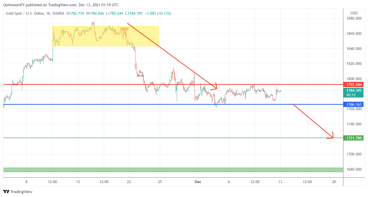 Looking at the chart, we have the first leg down from above 1860 under 1770 (1000 pips) and this recent rectangle could mean consolidation before continuation to the downside.