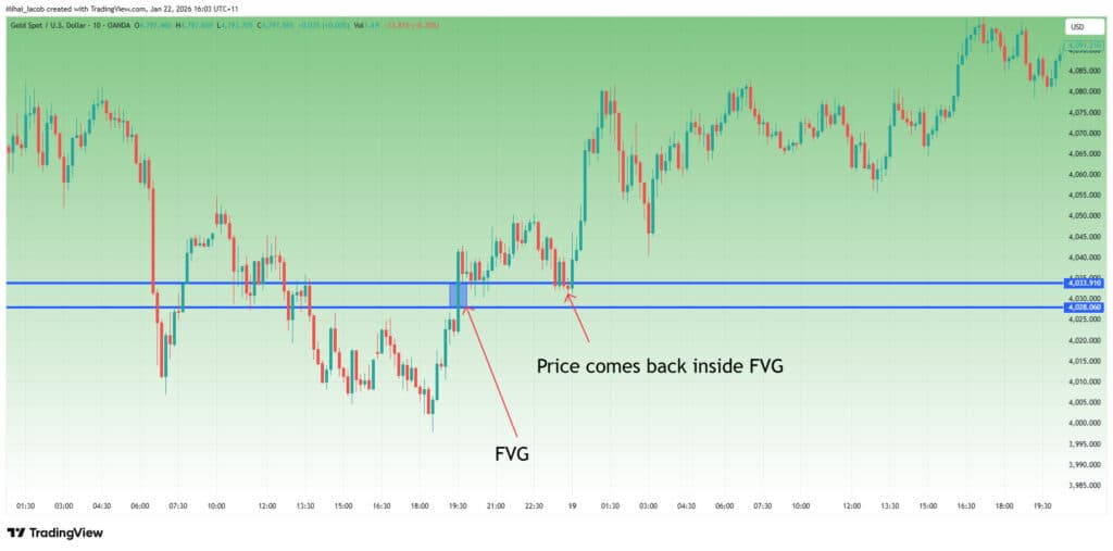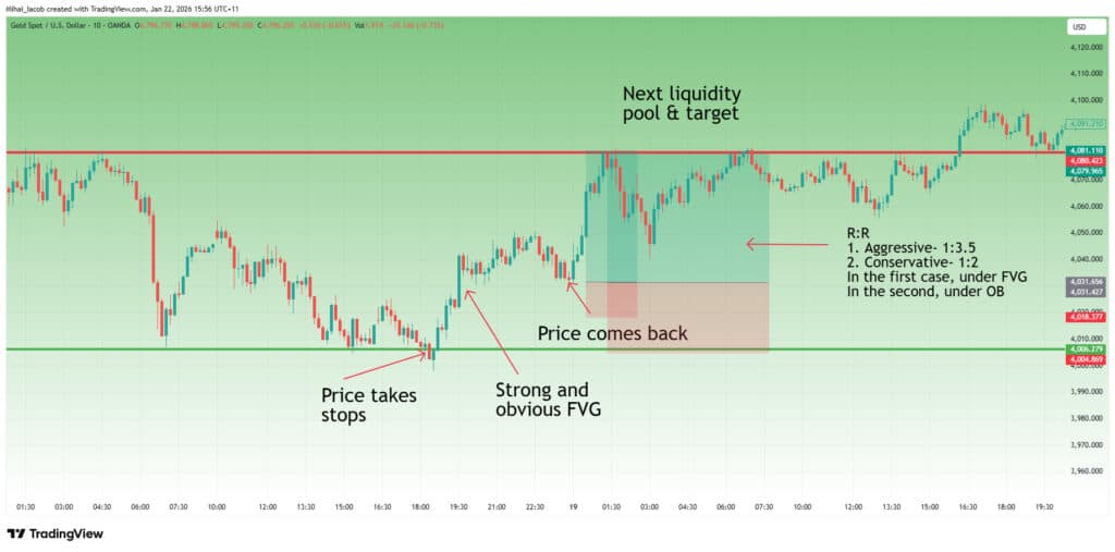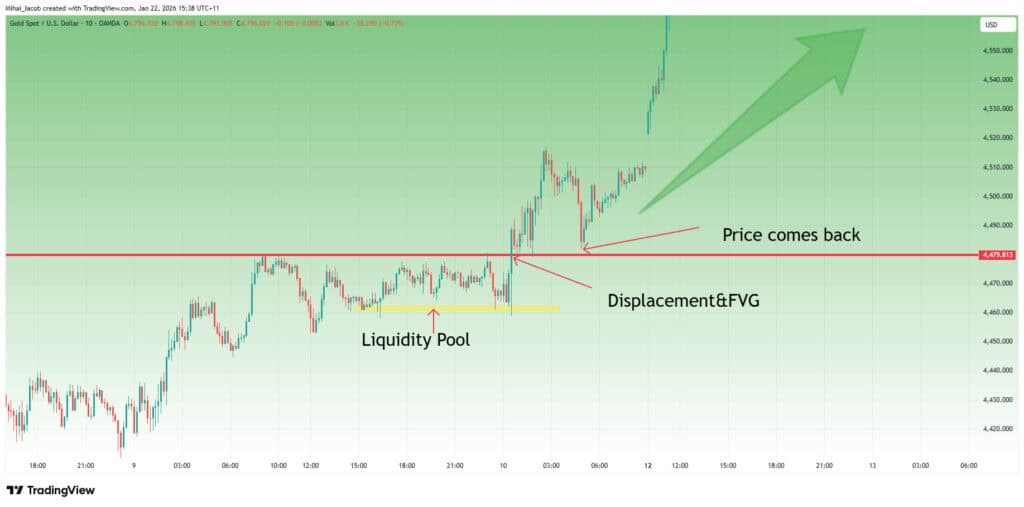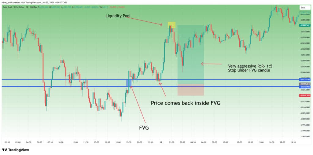 - MSS + displacement happens up (M15/M5) → FVG forms